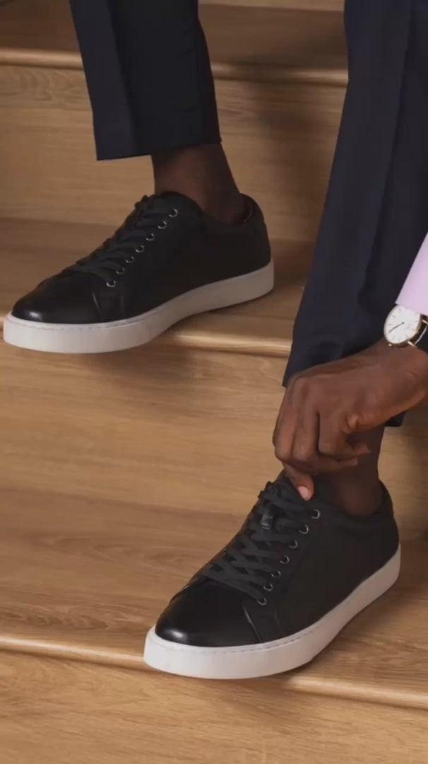 Crafted in smooth black leather, these sneakers redefine clean design. Theall-black upper paired with a crisp white solemakes them a versatile essential—equally at home with tailored trousers or casual denim.